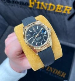 Crafted from premium materials, the Sky-Dweller features a robust Oyster case that ensures water resistance. The Oysterflex bracelet, made from ultra-elastic rubber, enhances comfort without sacrificing style. Its striking dial is easily readable, showcasing Rolex’s attention to detail and craftsmanship.